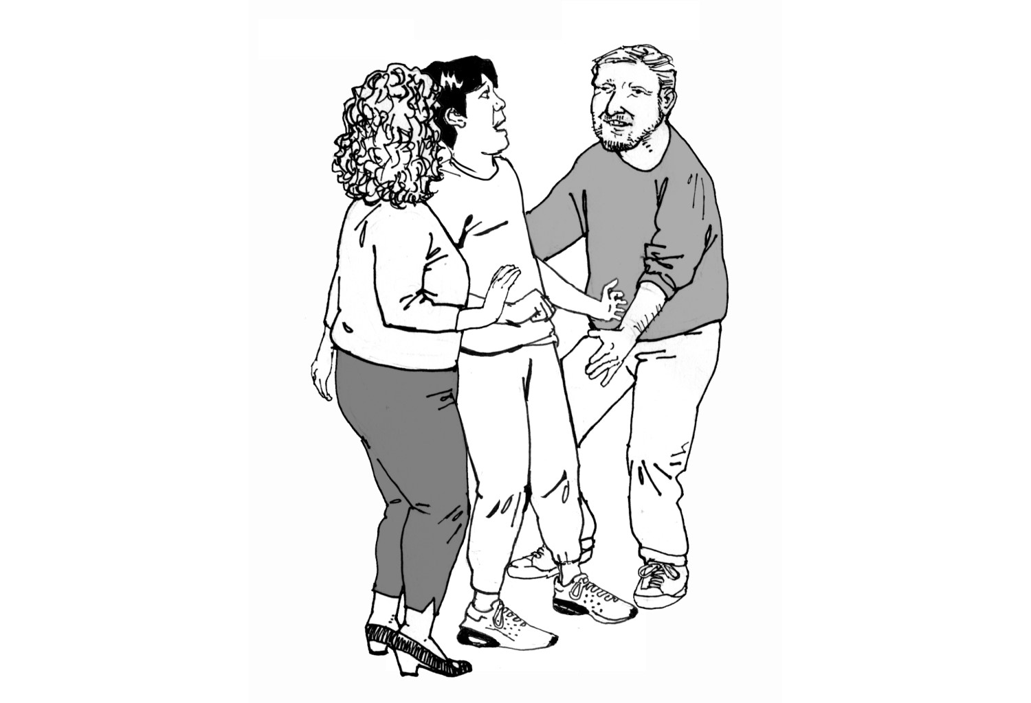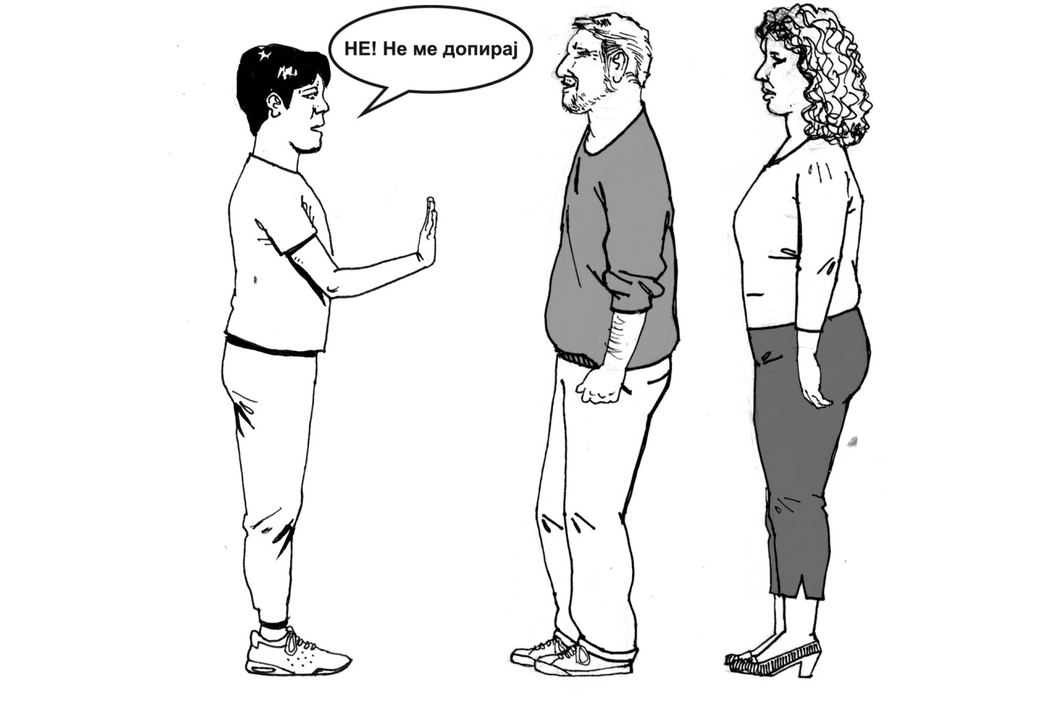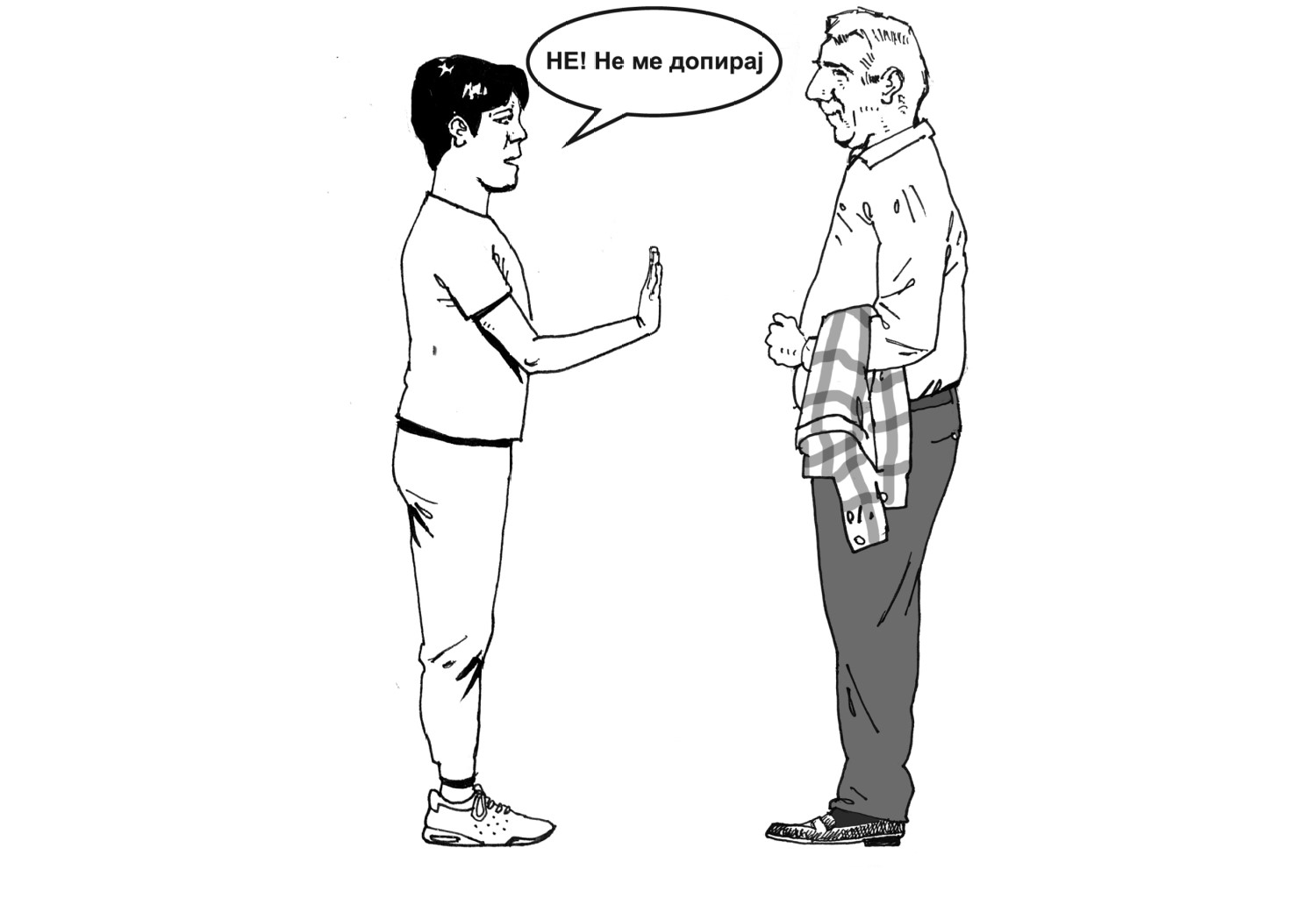 Некои допири некогаш ги доживуваме како пријатни, некогаш како непријатни. Во таа насока важно е да го охрабрите Вашето дете/ученик/роднина/корисник на непријатен допир да кажува „Не“ и да го искаже своето мислење, наместо да ги задоволува потребите на другите лица. Ликовите на илустрацијата именувајте ги согласно личностите, кои не се претставени во претходните ситуации, а се присутни во опкружување на Вашето дете/ученик/роднина/корисник.