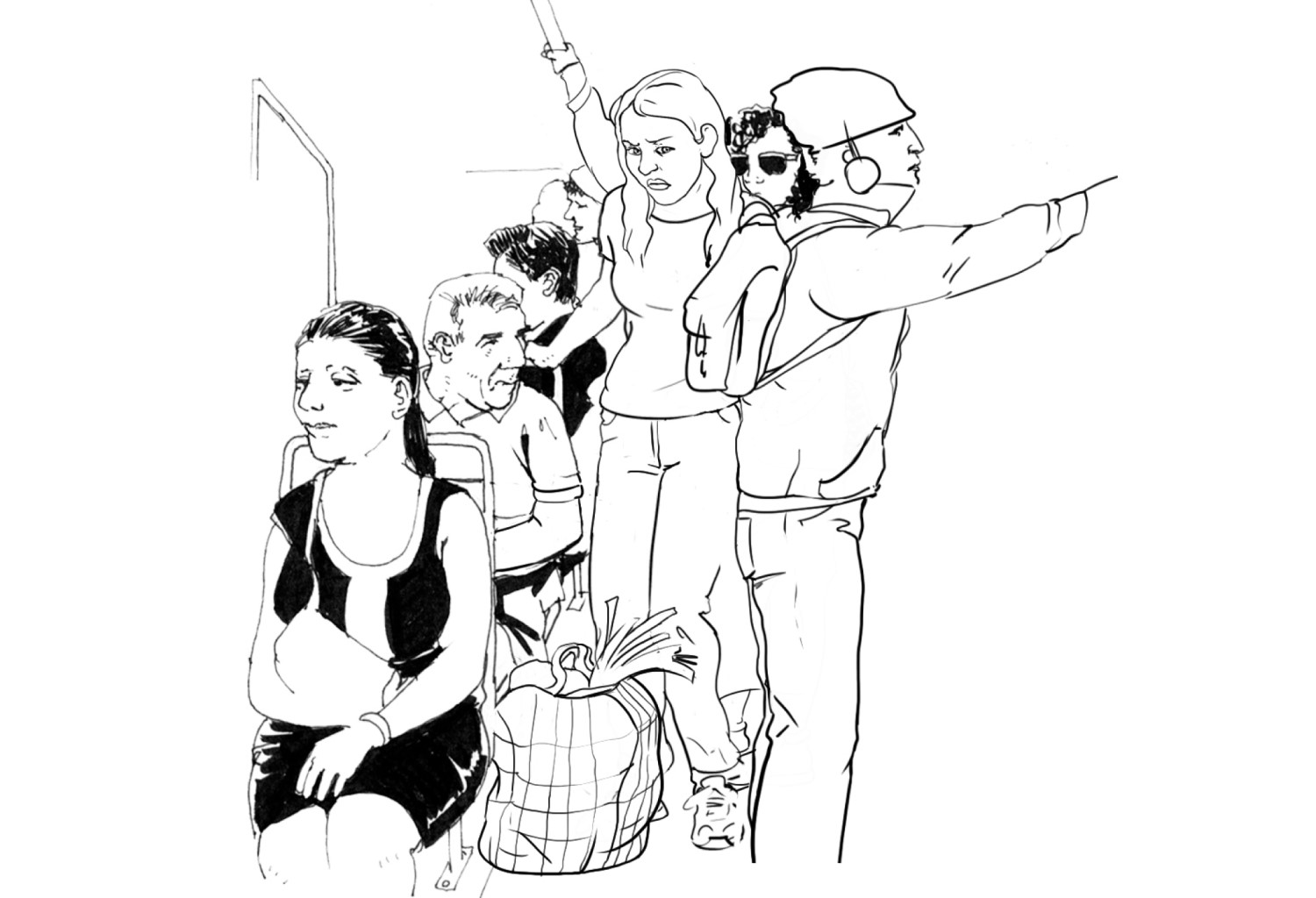 Опишете ја лицевата експресија, претставена на илустрацијата, со зборови кои и се познати на Вашата ќерка/ученичка/роднина/корисничка (стои меѓу многу луѓе, не се смее, не и е убаво и сл.). Дополнително опишете ја и поставеноста на телото (се обидува да не се допира до другите луѓе, стисната стои на едно место и сл.). Исто така можете да наведете и други ситуации во кои Вашата ќерка/ученичка/роднина/корисничка била меѓу многу луѓе. Покажете и на Вашата ќерка/ученичка/роднина/корисничка како изгледа Вашето лице кога Вие се наоѓате меѓу многу луѓе-гужва. Потоа побарајте од Вашата ќерка/ученичка/роднина/корисничка да покаже како изгледа нејзиното лице и тело кога таа стои меѓу многу луѓе. Предложените активности изведувајте ги пред огледало.